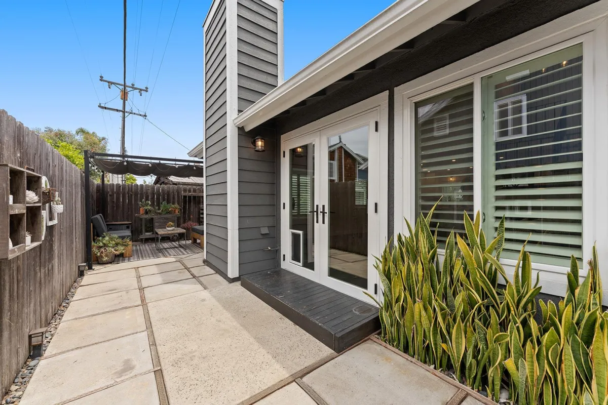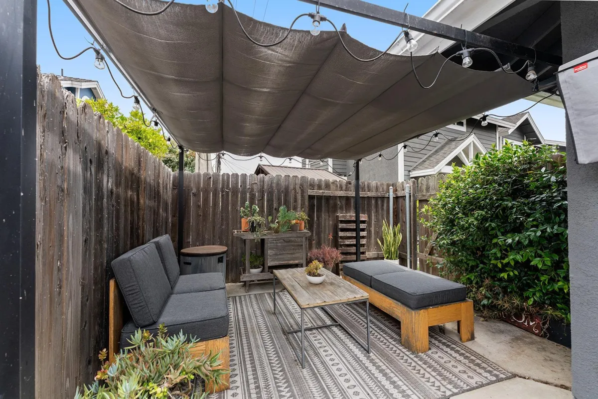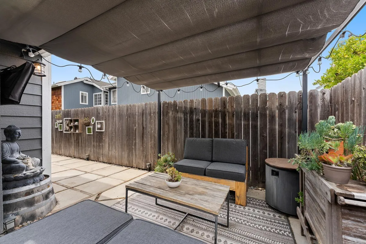 Step outside to a low-maintenance backyard designed for easy outdoor living, complete with artificial turf, hardscape, and space to grill and relax under the sun.